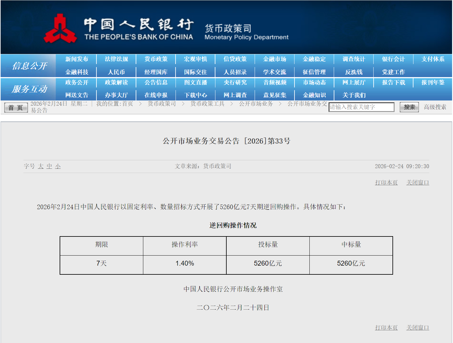 2月24日,央行开展5260亿元7天逆回购操作,操作利率为1.40%,与此前持平。