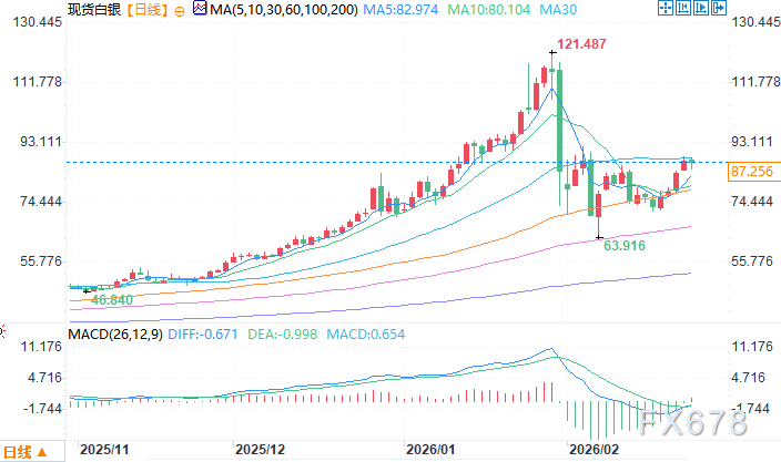 北京时间2月24日11:17 现货白银 报 87.43 美元/盎司
