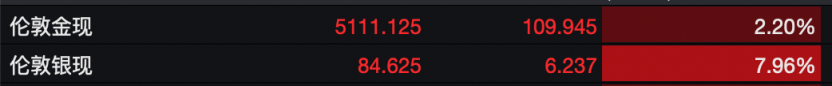 现货黄金、白银亦大幅走高,伦敦银现涨近8%。