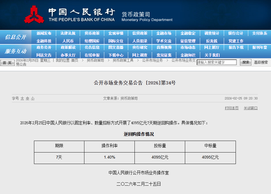 据央行官网2月25日消息,2026年2月25日中国人民银行以固定利率、数量招标方式开展了4095亿元7天期逆回购操作,操作利率为1.40%,与此前持平。