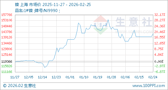 2月25日,生意社镍基准价为142533.33元/吨,与本月初(146016.67元/吨)相比,下降了2.39%。