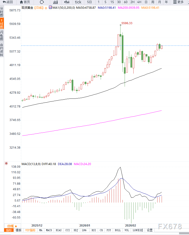 此外,黄金仍运行在长期均线系统上方。200周期移动平均线位于4930美元附近,构成中期上升趋势的重要支撑线,说明中期趋势仍然偏多。