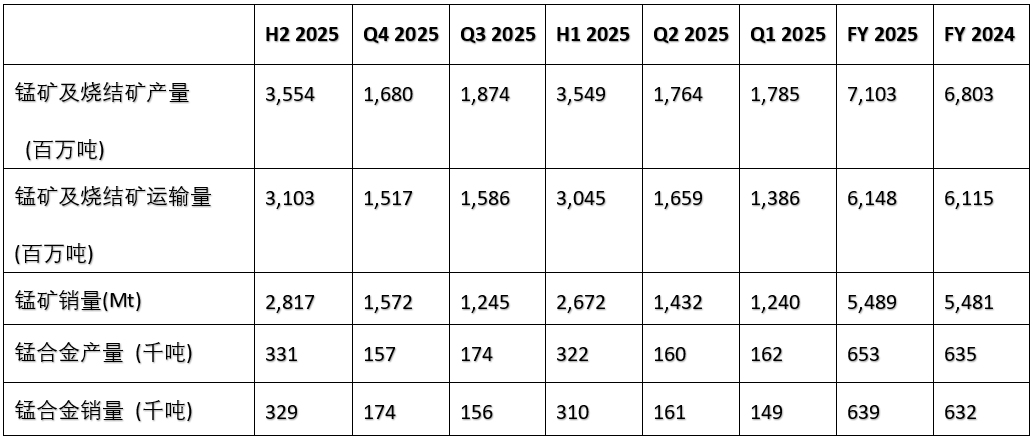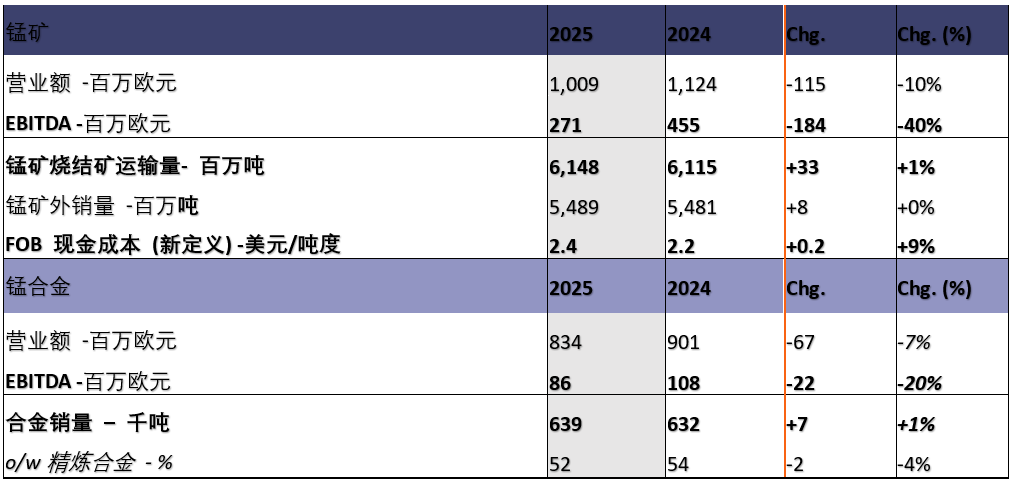 Dunkirk 工厂复产,2025年锰合金产量同比增长3%至65.3万吨,锰合金销量小幅增长1%,但产品结构略显不利(精炼合金占比52%)。