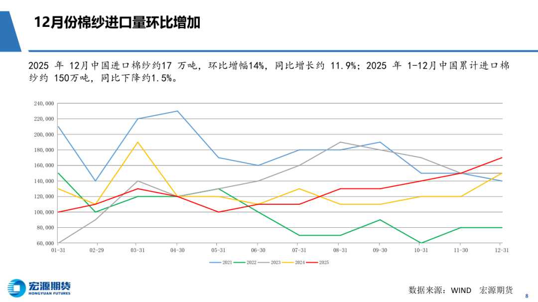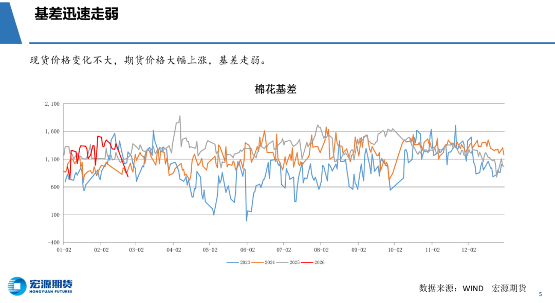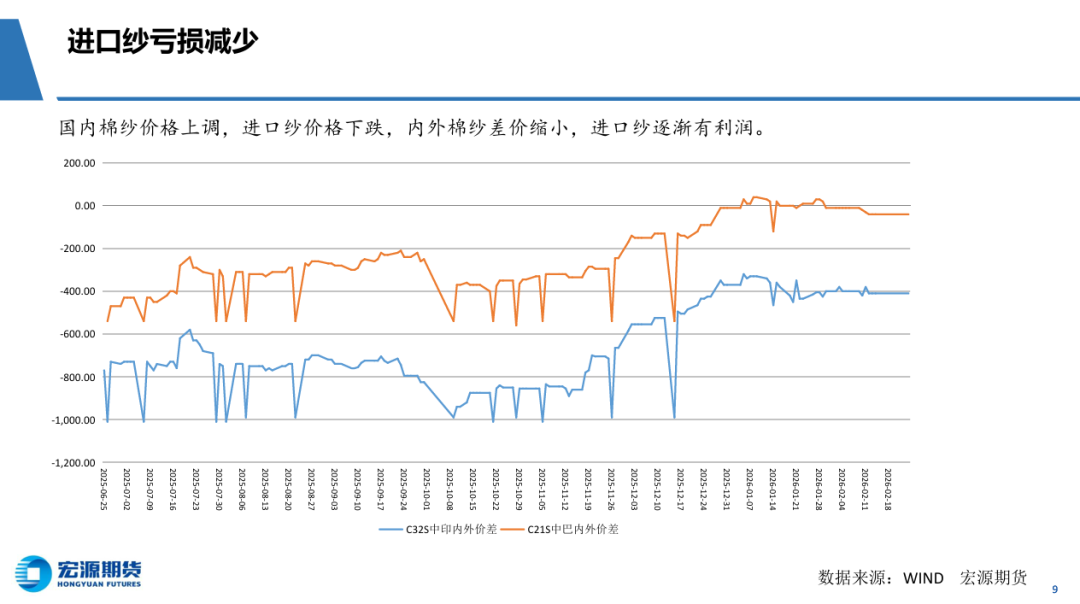 短期外棉仍处于巩固整理之中,国内棉花节后复工热情高涨,期货价格先行突破。内外棉花价差高达3200元/吨以上,接近 历史峰值。美国关税降低之路坎坷,棉花缺乏上涨基础,基金平仓棉花空单可能是价格上行动力。国内棉花节后涨幅较大,重要关口突破 后,需要ICE棉花继续上涨,或者回落等待外盘。操作上,CF2605合约多单适当减仓,等待回踩15000元再加仓。
