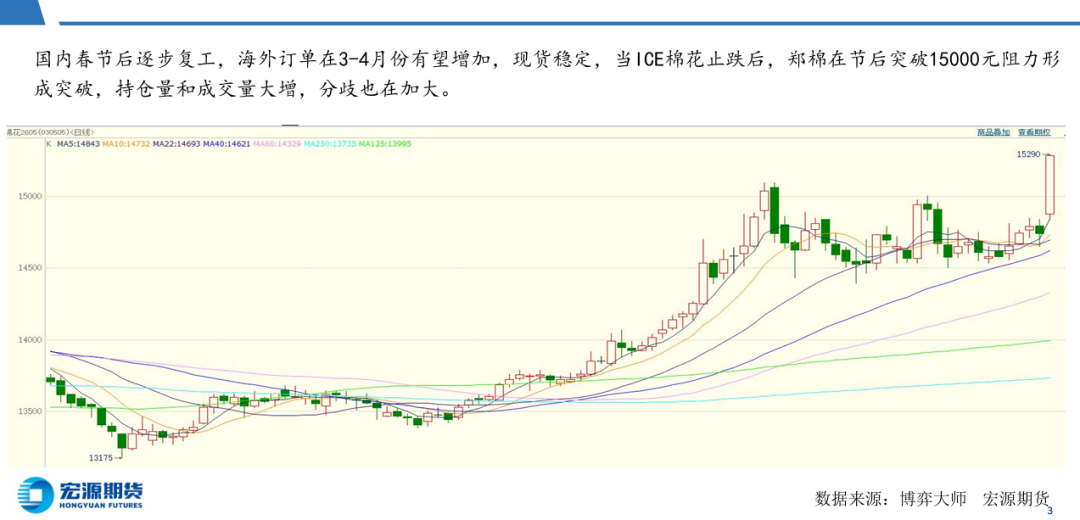国内春节后逐步复工,海外订单在3-4月份有望增加,现货稳定,当ICE棉花止跌后,郑棉在节后突破15000元阻力形成突破,持 仓量和成交量大增,分歧也在加大。