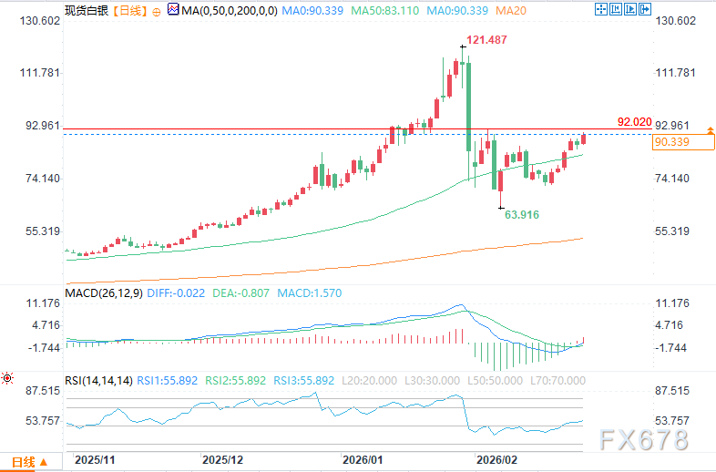 不过需要注意的是,即便当前银价走势强劲,多头仍需突破关键阻力位才能延续上行趋势:首先要攻克2月4日创下的92.20美元前期高点,突破该位置后,将进一步面临92.87—99.66美元的重要回调阻力区间,这一区间是前期银价上涨过程中的关键整理区域,预计将面临较强的获利盘抛压。