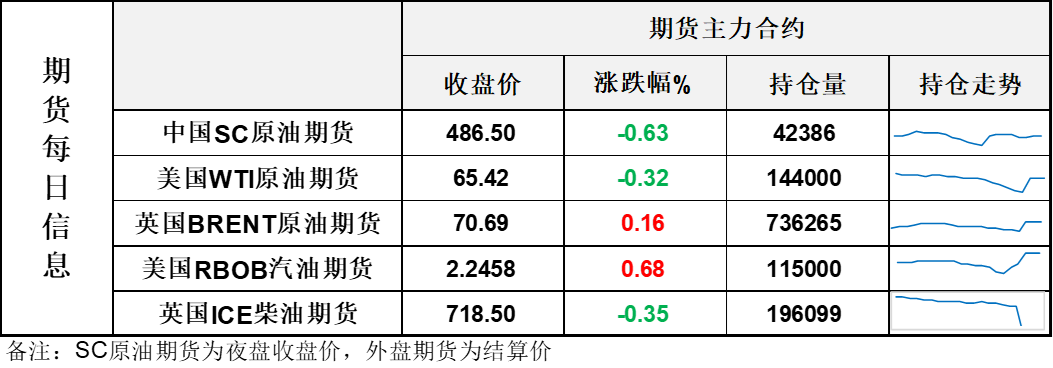 【1】WTI主力原油期货收跌0.21美元,跌幅0.32%,报65.42美元/桶;布伦特主力原油期货收涨0.11美元,涨幅0.16%,报70.69美元/桶;INE原油期货收跌0.63%,报486.5元。