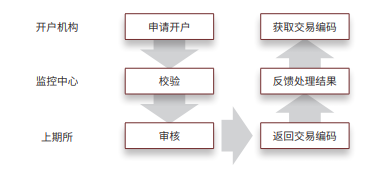 3. 开户机构向中国期货市场监控中心提交客户开户申请,监控中心审核校验 并通过后转发给能源中心,能源中心按照规则审核,通过审核的配发交易编码。 能源中心处理结果反馈给监控中心,由监控中心向开户机构反馈。开户机构将结 果反馈给客户。