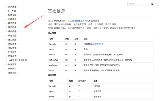 Tushare的官网上有很多数据的获取方式,就不一一列举,有兴趣的小伙伴可以自行查看,如图: