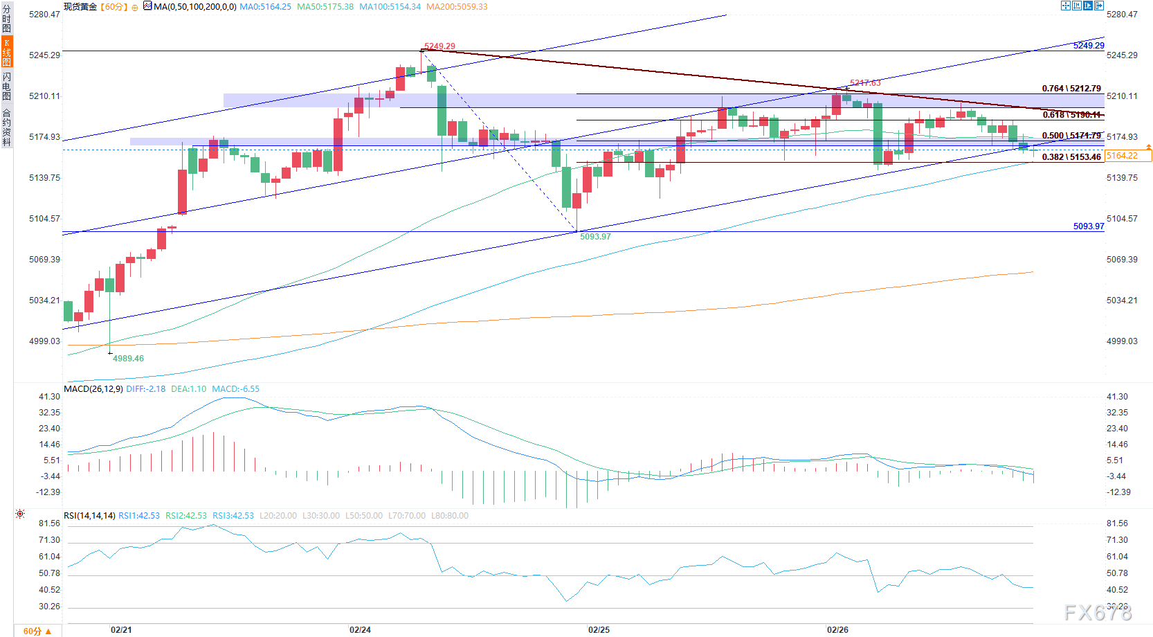 当前价格在0.382(5151.46美元)与0.764(5212.79美元)斐波那契回撤位间宽幅震荡,多空拉锯明显,图中呈现下降旗形或三角收敛,成交量低位萎缩,蓄势特征突出。反弹启动条件:若企稳多重支撑(5170-5150区间),MACD出现金叉、RSI回升(当前约43,中性偏弱但脱离超卖),可轻仓跟进。首先挑战紫色下降趋势线(约5200附近,前期高点密集区),阻力明显。若无法突破,反弹易受限,重回震荡。突破5200后,顺势上攻前高5249.29,确认回调结束,打开进一步上升空间。反之,若支撑带失守,警惕更深回调,甚至趋势转弱风险。