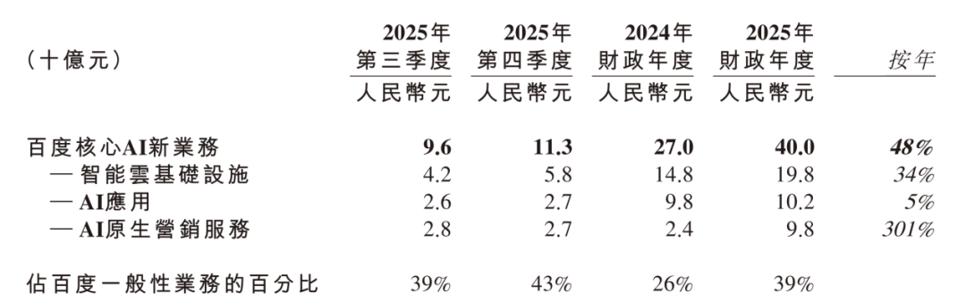 在这份备受瞩目的财报当中,百度Q4的总收入达到人民币327亿元,环比增长5%,其中首次披露的“百度核心AI新业务收入” 在四季度达到113亿元,占百度一般性业务收入的43%,环比三季度的96亿元增长17.7%。纵观2025年全年,该板块收入达到人民币400亿元,同比大幅增长48%。