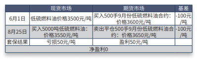范例:6月1日,某船供油企业和一个船东达成一份远期合约,同意在9月 份供应一批货,根据当时上海国际能源交易中心的低硫燃料油期货价格3500元 /吨,提出了固定价格。该船供油企业目前并没有货,为了锁定成本从而锁定利 润,该船供油企业决定在上海国际能源交易中心进行低硫燃料油期货交易。交易 情况如下表所示: