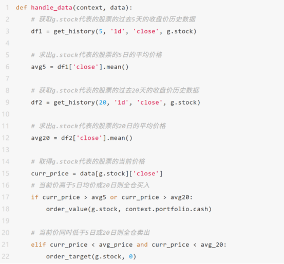 需要实现这个策略的关键是我们需要有办法可以拿到过去5天,过去20天的历史收盘价数据。那么作为一个成熟的量化交易工具Ptrade,它应该提供这样的方法,在python语言中,我们把实现不同功能的的方法,叫做“函数”,所以为什么我们上面提到的initialize和handle_data我们都叫“函数”。