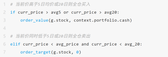 如果当前价高于5日均价或20日则全仓买入;