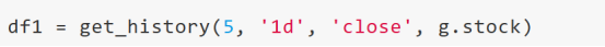 这里通过Ptrade提供的获取历史行情数据的接口get_history获取了最近的5日K线数据并且给这个数据取了一个变量(代号)叫“df1”,后面如果想使用这个数据,就可以直接使用"df1"了。