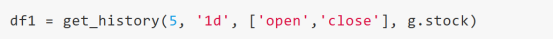 这里就是获取了g.stock代表的股票“600570.SS”,最近的5根k线,'1d'表示“日k线”,'close'表示‘收盘价’,如果既想要收盘价也想要开盘价,可以使用如下: