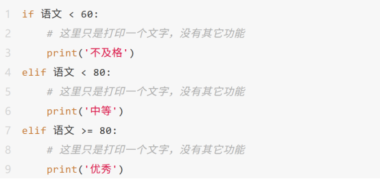 在python程序中"如果"就用"if" 表示,至于"eli"的意思是排除上面的条件之后的如果。比如:如果语文成绩小于60表示不及格,如果小于80表示中等,如果大于80则表示优秀,这里的第一个如果就用"if"表示,第二个如果其实是大于等于60并且小于80,和第一个如果是有区别的,这里就是用'elif'表示,使用python代码就是如下: