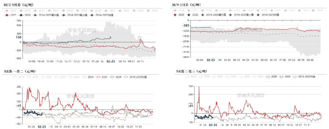 截至2月25日,RU05-09月差为130元/吨,较节前(2月13日)+10元/吨;RU09-01月差为-585元/吨,较节前+80元/吨。