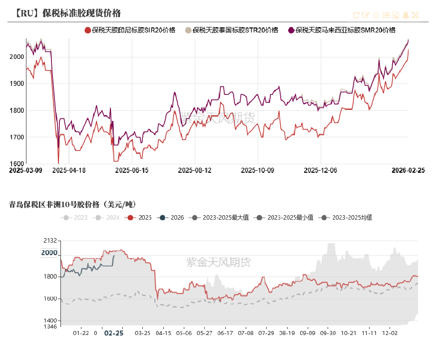 截至2月25日,保税区SIR20价格为2030美元/吨,较节前+110美元/吨,+5.7%;