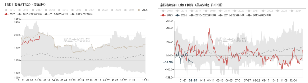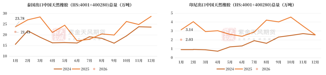 2026年1月泰国出口同比减少,或因前期洪水对原料供应的滞后影响;2月进入季节性低产期,叠加中国春节,出口量环比预计继续下滑。