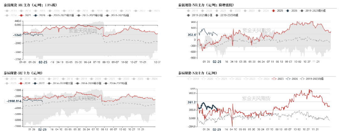 截至2月25日,泰混-RU价差为-1240元/吨,较节前-225元/吨;泰混-NR价差为202.6元/吨,较节前-204元/吨。