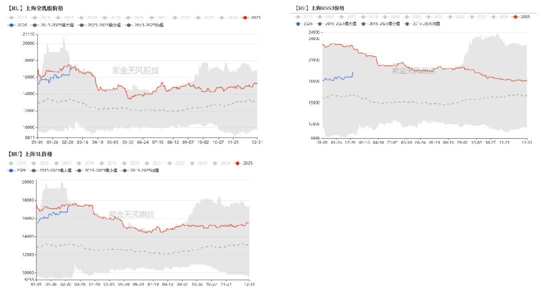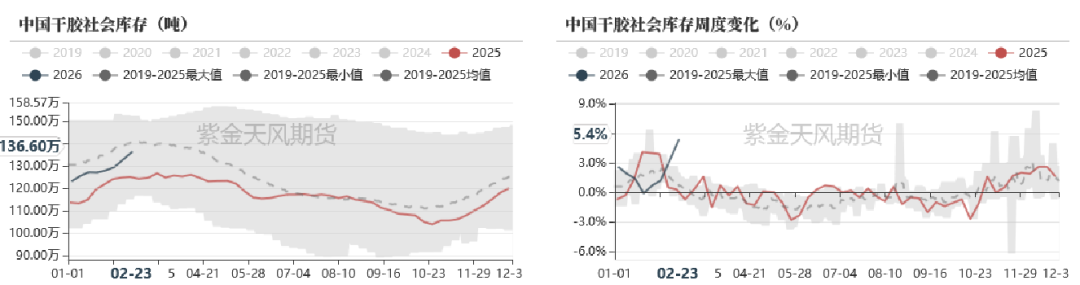 基本面:供应端,海外处于季节性减产期,泰北已大面积停割,泰南尚未完全停割,工厂存补库需求推动胶水供不应求,价格较春节前上涨6.45%,后续仍有上行空间(强);泰国对中国出口量同比降11%,但越南及科特迪瓦增量弥补缺口,海外整体出口稳定,预计国内1月进口持稳。需求端,随着下游复工复产,需求略有提振,预计3月初将有所回暖(强)。库存方面,本周期社库增5.4%,略高于去年春节的4.1%,仍在合理区间,累库压力可控。整体来看,短期成本端对价格形成底部支撑,后续核心关注点将转向消费与库存的博弈,重点关注3-4月去库拐点。