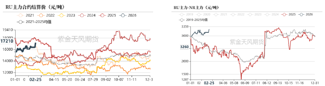 截至2月25日,RU-NR主力合约价差为3260元/吨,较节前(13日)+125元/吨,+4%。