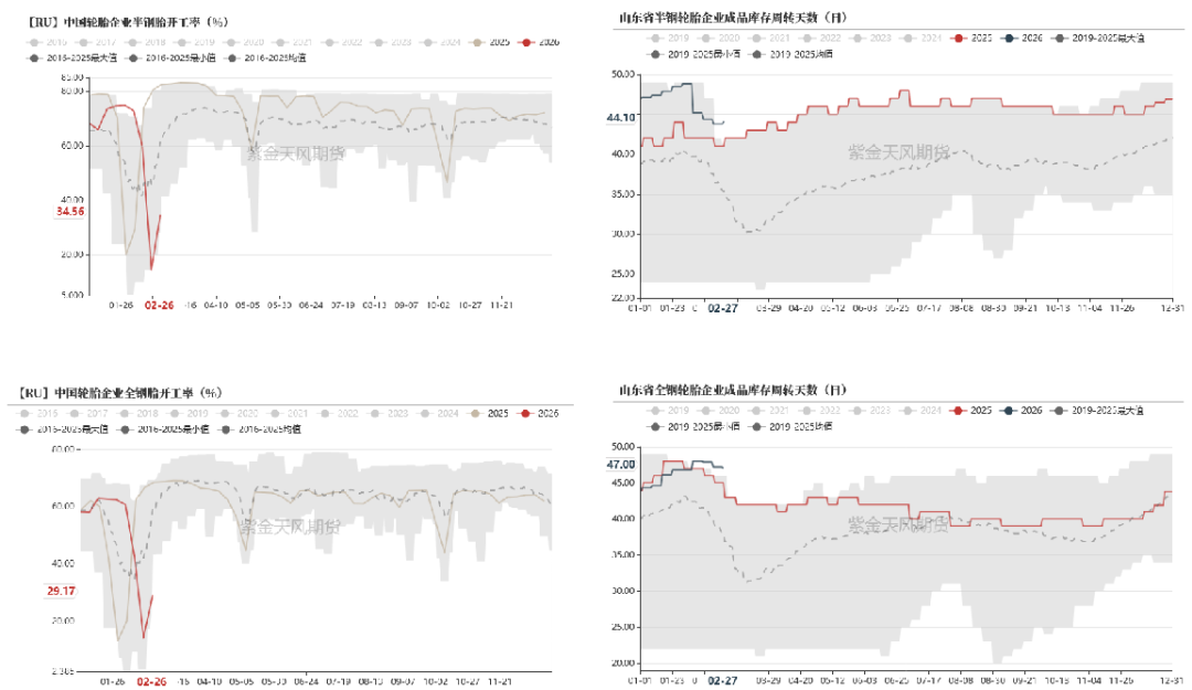 截至2月26日,半钢胎样本企业平均库存周转天数在44.09天,环比+0.34天,同比+2.18天;全钢胎样本企业平均库存周转天数在47.04天,环比-0.12天,同比+3.64天。