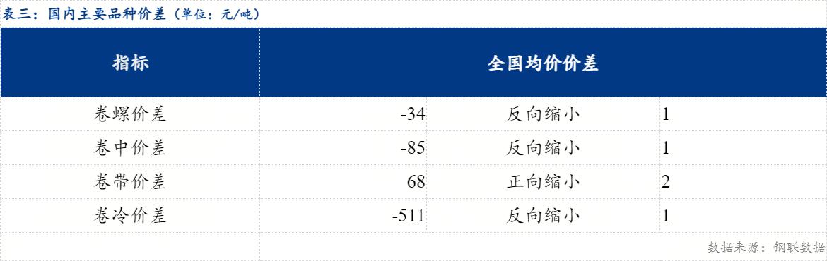 从品种价差来看,卷螺差较上一交易日反向缩小1元/吨,热中价差较上一交易日反向缩小1元/吨,热带价差较上一交易日正向缩小1元/吨 ,热冷价差较上一交易日反向缩小1元/吨。