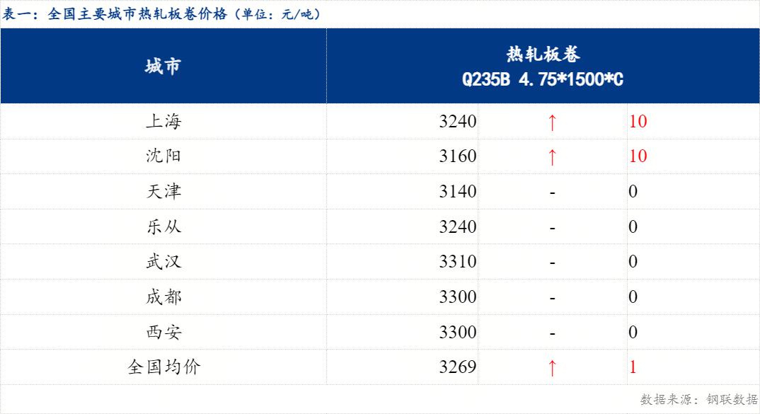 截止发稿时4.75热轧板卷全国均价3269元/吨,较上一交易日上涨1元/吨。其中主要城市价格为上海3240元/吨,沈阳3160元/吨,天津3140元/吨,乐从3240元/吨,武汉3310元/吨,成都3300元/吨,西安3300元/吨。