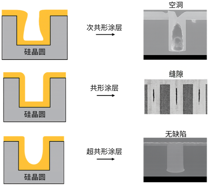 当深宽比超过 5:1 并逼近 10:1 及以上时,薄膜必须沿整个通孔轮廓保持连续。任何薄弱点都将在后续工序中被放大。