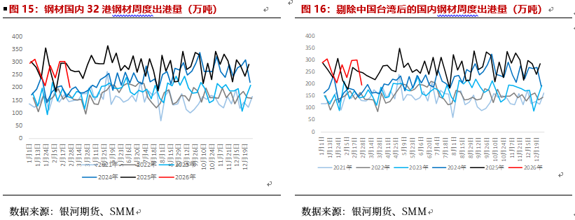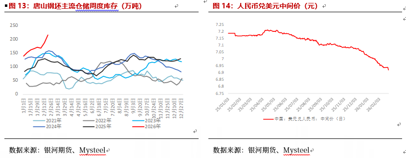 此外,2025年以来,欧盟,东盟,非洲,墨西哥,日韩等地纷纷向中国出口商品提出双反调查,2026年1月起中国钢材出口许可证制度开始实行,对板材和钢坯出口的影响较大,2月起钢材出口的高频数据开始下滑,钢坯接单情况转弱,社会库存增至历年同期最高水平,或对后续出口产生进一步影响。