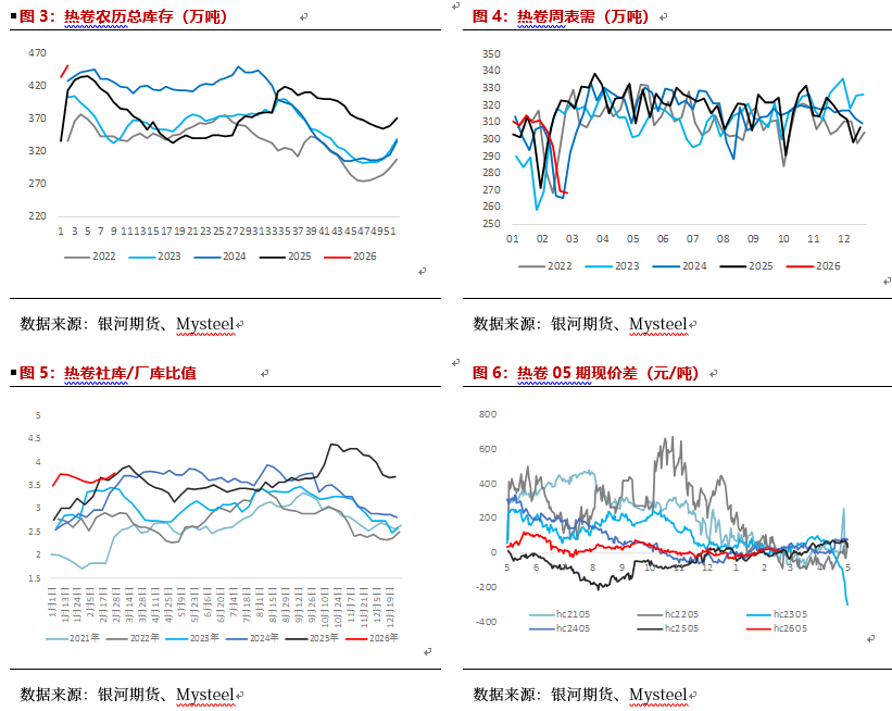 因此从基本面来看,热卷价格压力仍存,但地缘影响可能使得热卷价格产生波动,整体维持震荡偏弱走势,下方空间可能有限。从套利策略来看,做空卷螺差,以及基差逢低时介入卖出套保也是较好的选择。短期需要观望“两会”宏观政策导向,若“两会”宏观政策出现超预期宽松的情况,可能带动黑色板块上涨。此外关注海外地缘动向,霍尔木兹海峡的封锁周期。关注国内贸易商持货情况。