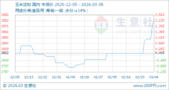 3月5日生意社玉米淀粉基准价为2884.00元/吨