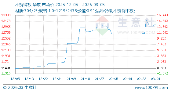 3月5日,生意社不锈钢板基准价为13083.33元/吨,与本月初(12991.67元/吨)相比,上涨了0.71%。