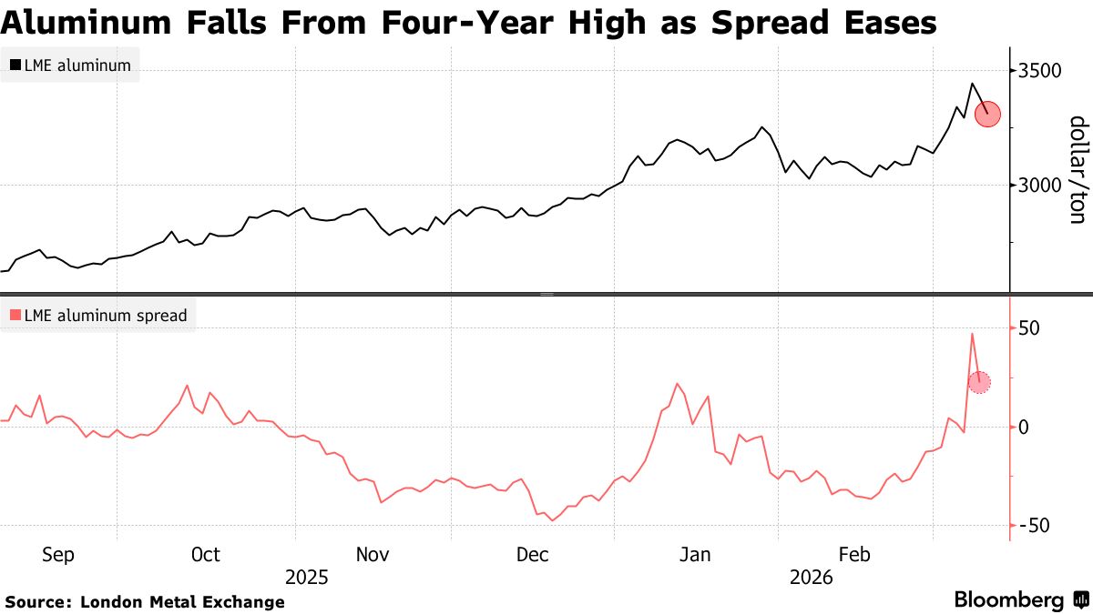周二,伦敦金属交易所(LME)铝期货跌2%至每吨2215美元。在金融市场普遍遭遇抛售之际,铝价周一已出现回落。铝价此前一度触及每吨3,544美元,为2022年3月以来的最高水平,原因是中东地区冲突不断升级,霍尔木兹海峡事实上处于关闭状态,切断了波斯湾地区的铝运输,而该地区供应约占全球铝供应的9%。与此同时,现货对三个月期铝价差周一也从盘中高点每吨59美元回落至22.47美元,表明市场对供应紧张的担忧有所缓解。
