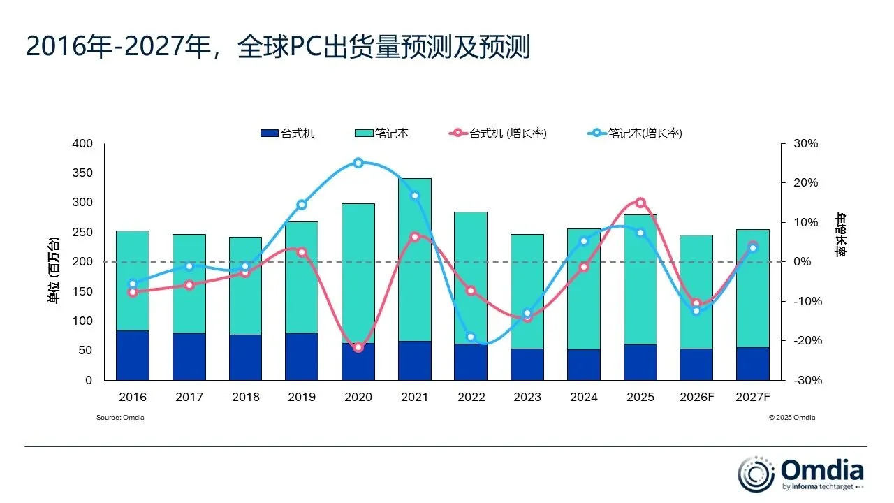 IT之家3月12日消息,Omdia昨日最新预测,2026年全球台式机、笔记本及工作站出货量预计下降12%,至2.45亿台。这一预测基于内存与存储价格的急剧上涨——特别是预计2026年第一季度将至少上涨60%。