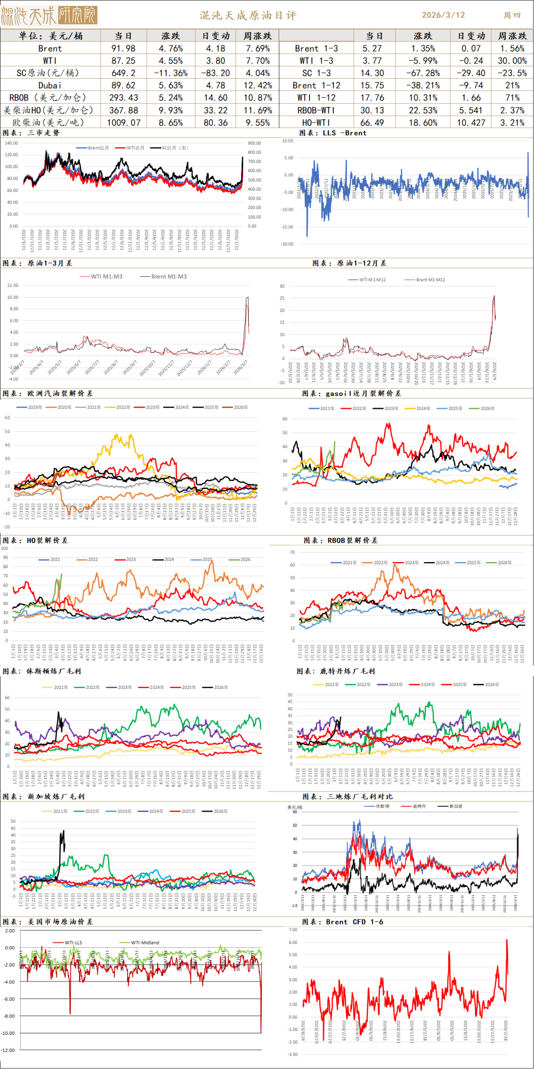 库存价差:截至3月6日,EIA原油库存上升382万桶,汽油库存下降365万桶/日,馏分油库存下降135万桶/日。