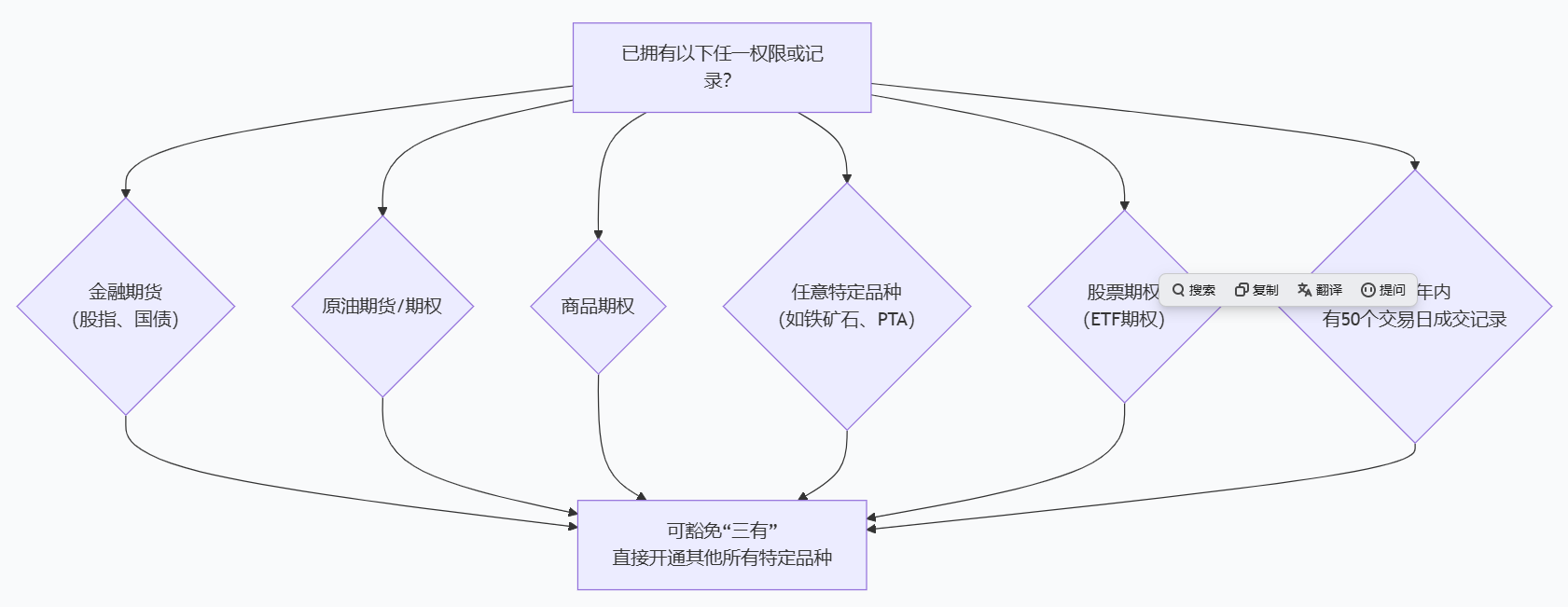 这里有一个非常实用的规则:如果你已经拥有某些交易权限,开通新的特定品种会便捷很多。这就像有了一个通行证,可以免去部分或全部考核。