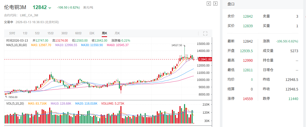 随着中东冲突再度升级,国际油价出现大幅上涨,市场对美国通胀回升的预期重新抬头,美联储降息预期延后的情绪也随之升温。再加上美元上涨等宏观层面的不利因素,共同对铜价形成压制。与此同时,铜库存高企使得铜价承压,但铜精矿供应偏紧的情况,仍从供应端给铜价提供了一定支撑,从而限制了铜价的下跌幅度。截至3月13日16:36分,伦铜跌0.82%,其周线两连跌,当周周线暂时跌0.86%;沪铜主力合约跌0.55%,其周线连跌两周,当周跌0.47%。 当前宏观层面不确定性仍存,而基本面上,随着下游消费逐步复苏所带来的去库预期逐步显现,铜价后市将如何表现?