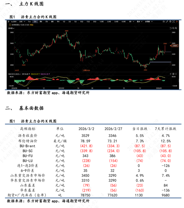 【1】期货盘面:BU 2604主力合约大幅跳涨。收盘价3529,较上个交易日收盘价环比上涨5.98%,盘中最高触及3560,最低3367。06远月合约环比上涨6.09%。