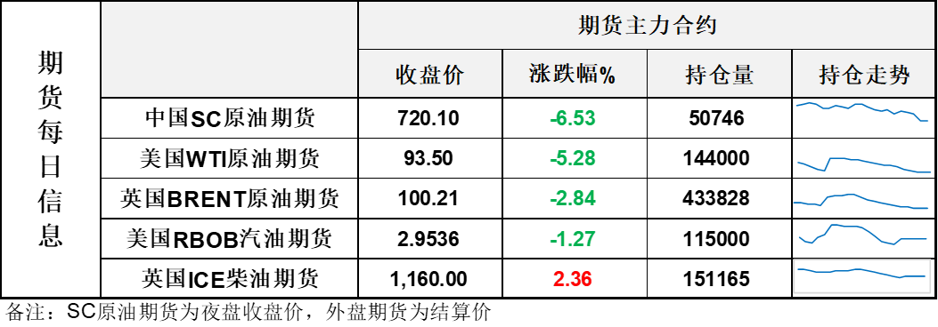 【1】WTI主力原油期货收跌5.21美元,跌幅5.28%,报93.5美元/桶;布伦特主力原油期货收跌2.93美元,跌幅2.84%,报100.21美元/桶;INE原油期货收跌6.53%,报720.1元。