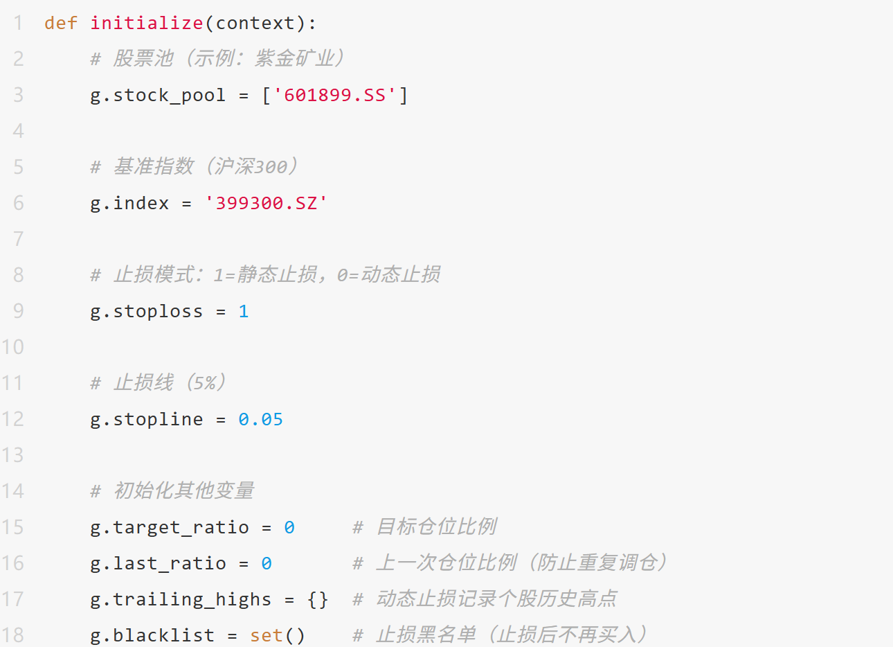 在量化交易中,止损和趋势跟踪是两大核心策略。今天,我将分享一个基于Ptrade的双均线动态止损策略,该策略不仅能够自动判断市场趋势(5日/20日均线),还支持静态止损和动态止损两种模式,有效控制风险!文章将详细解析策略逻辑,并提供完整代码+逐行注释,帮助大家快速上手!