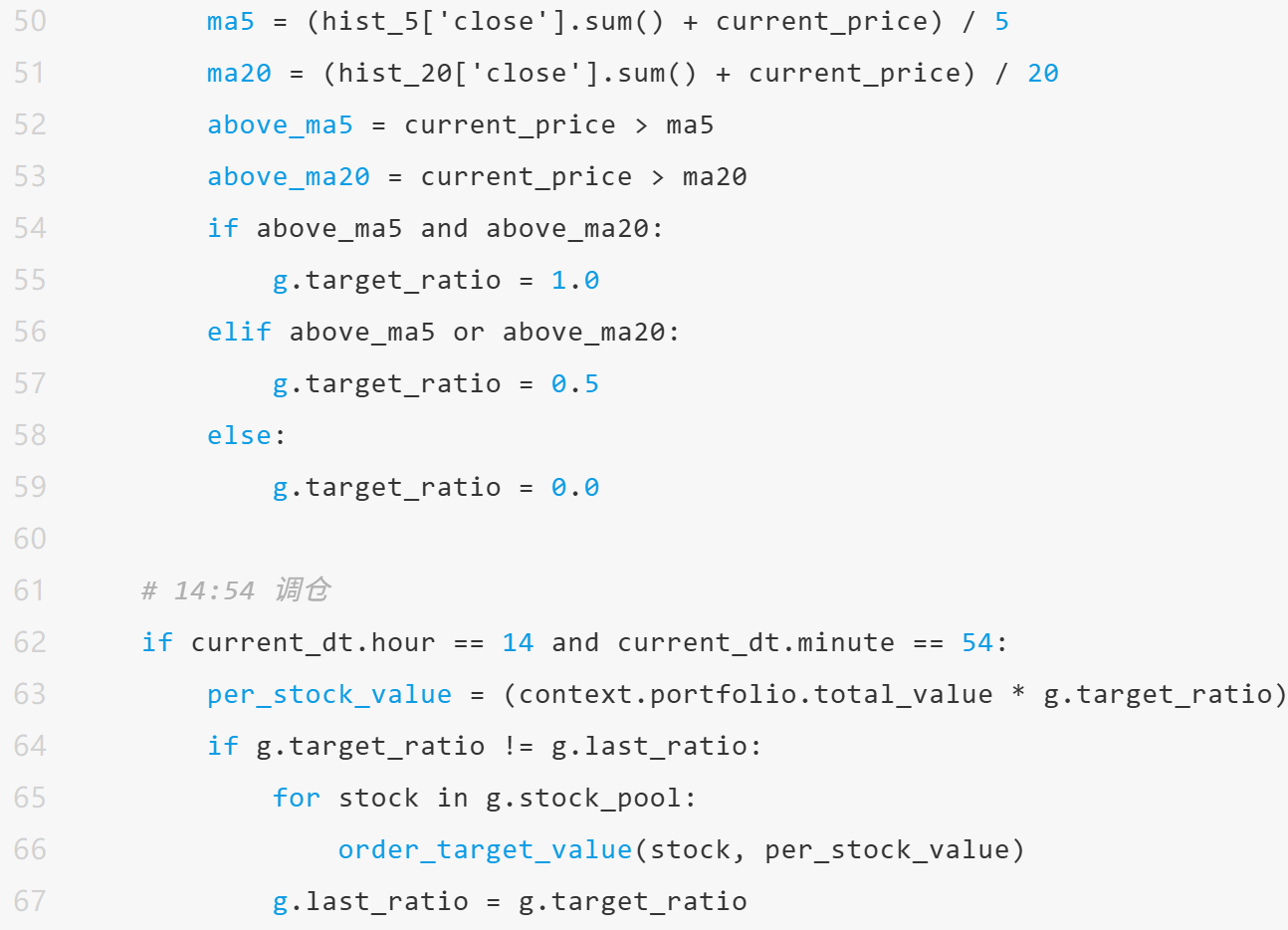 3、自动调仓:每日14:50-14:54执行止损→释放资金→调仓,避免盘中频繁交易。