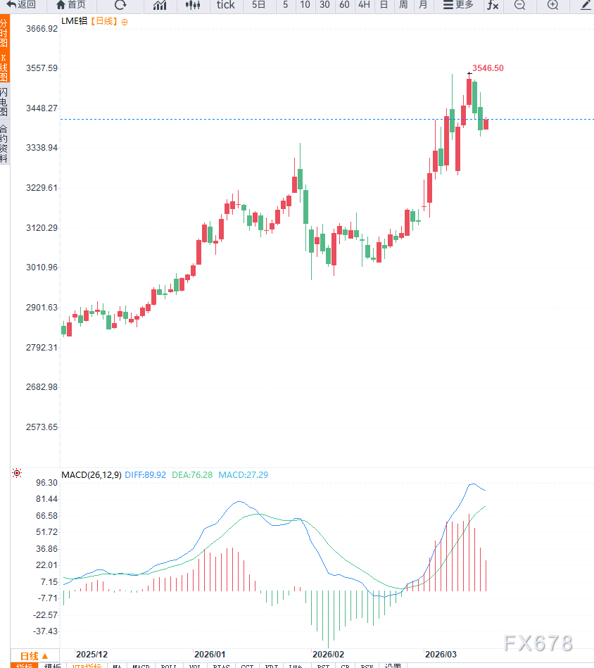 4小时图显示,铝价短周期震荡偏强,价格围绕3410-3430美元/吨区间反复波动,MACD指标位于零轴上方但动能减弱,显示短线上涨空间有限,市场在等待几内亚政策落地及供应端消息刺激。均线系统呈走平状态,多空力量暂时均衡,短线可能维持区间震荡。