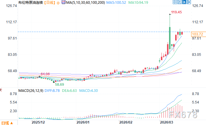 北京时间3月17日14:06 布伦特原油连续 报 104.75 美元/桶