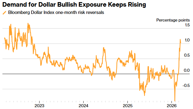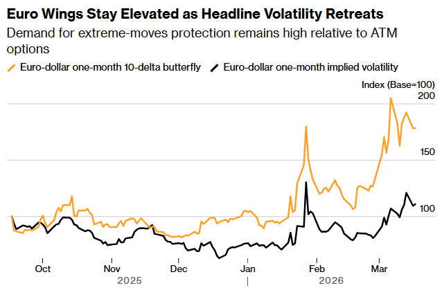外汇交易员们正在增持对冲工具,以应对极端波动,并为中东局势的下一步发展做好准备。在伊朗战争爆发和油价飙升至每桶100美元带来的最初冲击之后,投资者正利用相对平静的时期,买入低概率期权,这些期权会在货币汇率突然波动时带来收益。