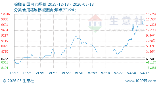 3月18日,生意社棕榈油基准价为9800.00元/吨,与本月初(8740.00元/吨)相比,上涨了12.13%。