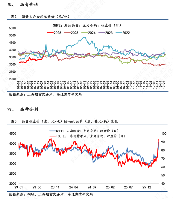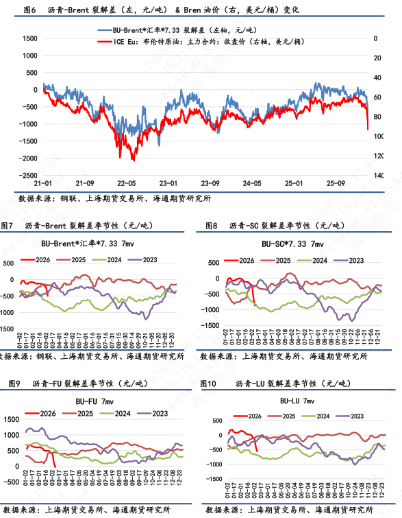 【4】短期来看,美伊地缘溢价仍持续赋予沥青上涨动力。随着油价突破上冲至110美元/桶附近,沥青盘面也持续跟涨。由于沥青牵连此次地缘的相关性要弱于原油和燃料油,所以可以观测到上周以来沥青-Brent、沥青-SC、沥青-FU/LU均出现大幅地下滑。其涨幅能力不及原油和燃料油。这也引发了下游沥青炼厂生产利润端的担忧,从而制约生产积极性。目前从盘面上看,包括释放储备等地缘边际改善的迹象给投资者带来溢价出浮,但是伊朗和美国之间的军事冲突仍具有反复不确定性。特别是关注霍尔木兹海峡的实际流通量。目前来看,船只依旧原地待命,不敢进出海峡。海峡是否正常通行依旧是观测能源高溢价出沫的重要监测指标。