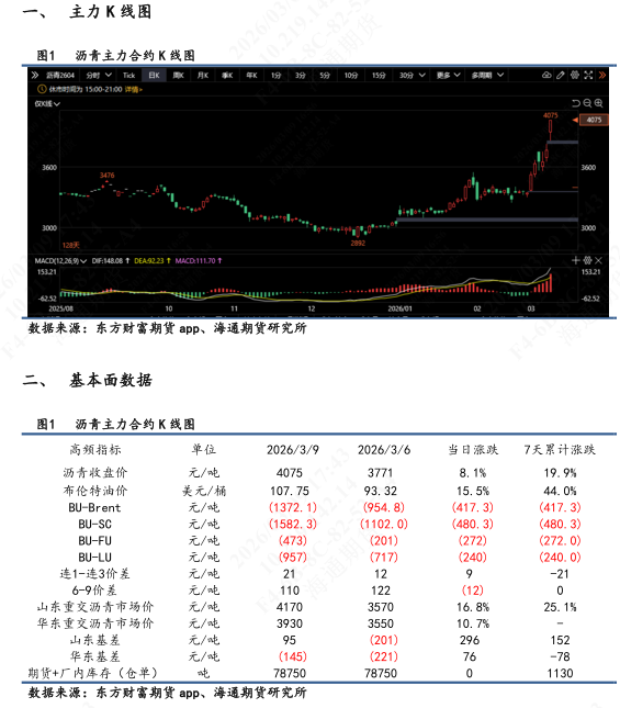 【1】期货盘面:BU 2604主力合约涨停板收盘。收盘价4075,较上个交易日收盘价环比上涨8.99%,盘中最高触及4075,最低3870。06远月合约同样封板。
